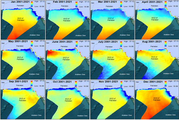 SUPARCO monitors sea surface temperature (SST), chlorophylla concentration, and salinity along Pakistan’s coastal and marine waters to assess the physical, biological, and chemical status of the ocean. SST data help track thermal variations and climate-driven changes, chlorophylla indicates phytoplankton productivity and overall ecosystem health, and salinity measurements reveal freshwater inflows, seawater intrusion, and coastal water quality. By combining satellite remote sensing with in-situ observations, SUPARCO provides continuous, large-scale monitoring that supports sustainable management of fisheries, early warning for harmful algal blooms, evaluation of ecosystem health, and informed climate adaptation planning along the Sindh and Balochistan coasts.