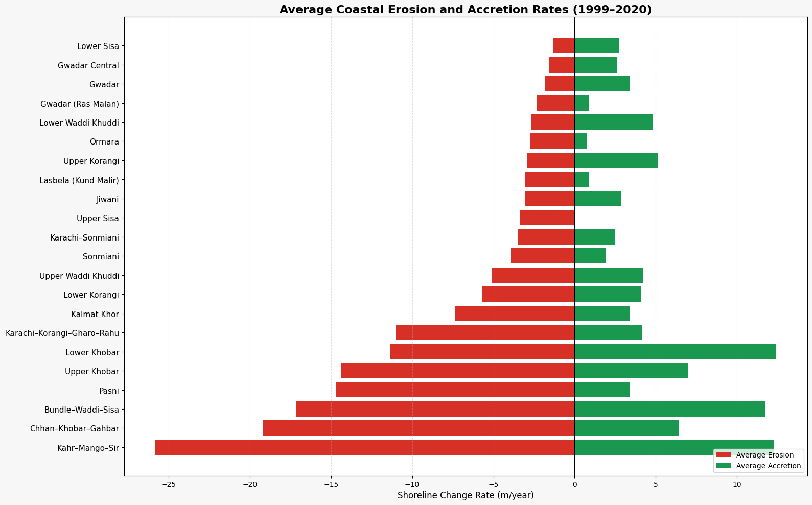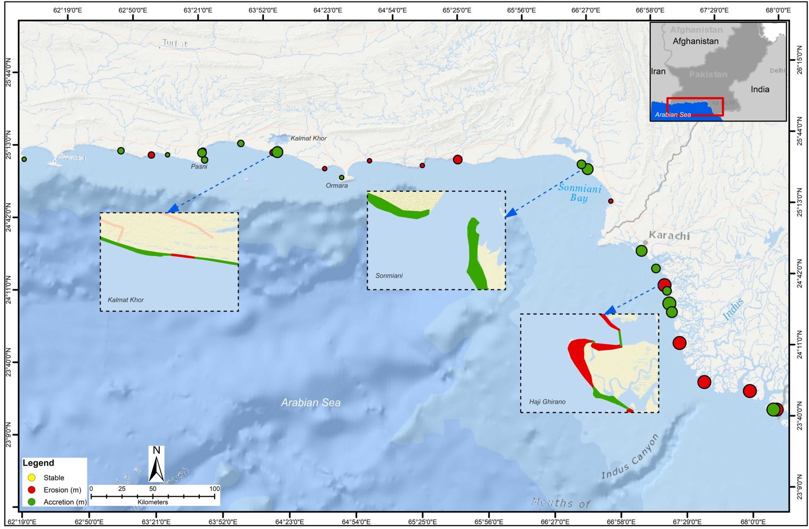 In contrast, the Makran Coast (Balochistan) exhibits a mixed pattern of erosion and accretion. Pasni represents the most severe erosion hotspot, with retreat rates up to 82.02 m yr⁻¹, while areas such as Kalmat Khor, Gwadar, and Jiwani show strong local accretion despite mild average erosion, indicating active sediment redistribution. Other stretches, including Ormara and Sonmiani, experience moderate but persistent shoreline retreat. Overall, shoreline change between 1999 and 2020 highlights the dynamic and region-specific nature of coastal erosion and accretion in Pakistan, underscoring the importance of continuous monitoring to identify vulnerable zones, protect coastal ecosystems, and support climate-resilient coastal management.