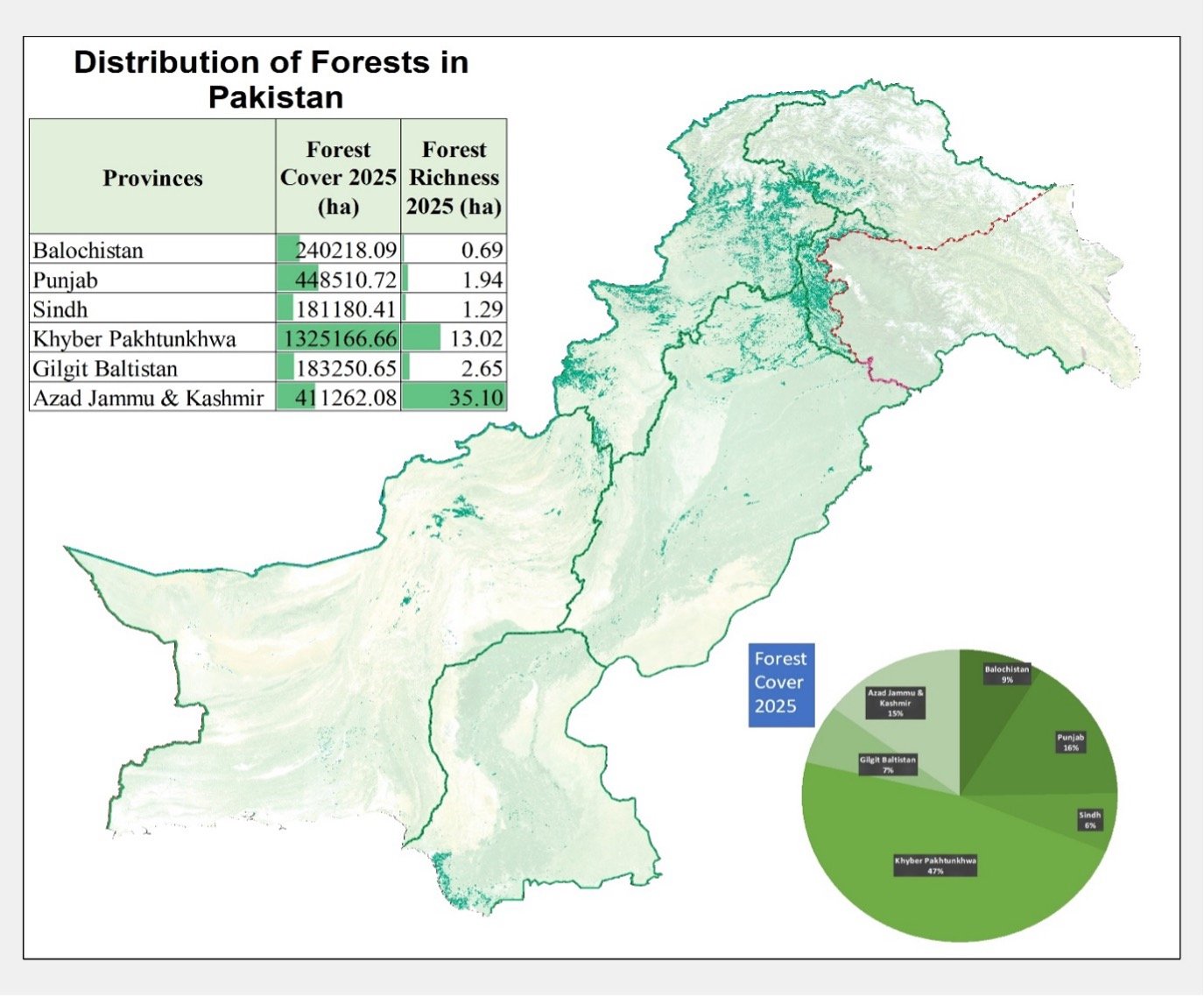 Forests are spread across specific regions of Khyber Pakhtunkhwa (1.32 million ha, 47.5%), Punjab (0.45 million ha, 16.14%), Azad Kashmir (0.42 million ha, 15%), Balochistan (0.24 million ha, 8.6%), Gilgit Baltistan (0.18 million ha, 6.6%) and Sindh (6.5%), respectively. This highlights the significance of Khyber Pakhtunkhwa forests in term of national resources and need for forest conservation to as climate mitigation strategy.